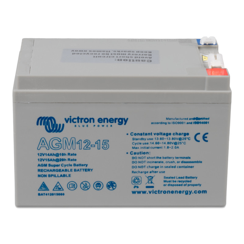 Akumulator 12V/15Ah AGM Super Cycle z terminalami gwintowanymi M5 firmy Victron Energy to wysokiej klasy bateria przeznaczona do pracy cyklicznej. Idealnie sprawdza się w instalacjach solarnych off-grid, kamperach, łodziach oraz innych aplikacjach wymagających odporności na głębokie rozładowania.