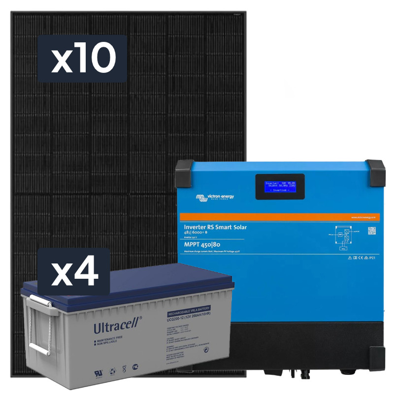 Elektrownia słoneczna 4350W z akumulatorem – zasilanie 230V moc 4500W + MPPT to niezawodne źródło energii, idealne dla wymagających użytkowników. Wyposażona w cztery akumulatory Ultracell GEL (200Ah każdy) oraz falownik Victron Energy RS Smart 48/6000, zapewnia zasilanie urządzeń do 4500W. Bez trudu poradzi sobie z lodówkami, zamrażarkami, elektronarzędziami, klimatyzacją czy pompami, dostarczając energii tam, gdzie jej potrzebujesz.