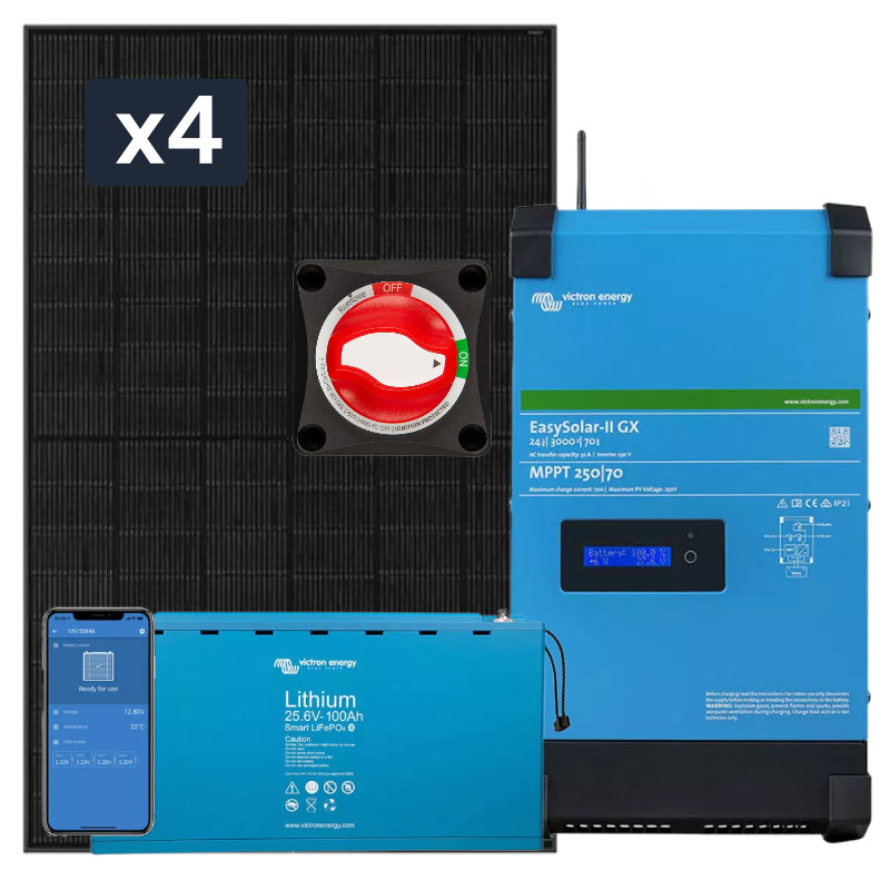 W skład systemu wchodzą panele słoneczne Epever, akumulator LiFePO4 o pojemności 100Ah, przetwornica hybrydowa Victron Energy EasySolar oraz niezbędne okablowanie, co zapewnia szybki i łatwy montaż. Wszystkie elementy są już przygotowane do montażu, a zestaw zawiera schemat oraz instrukcję obsługi.